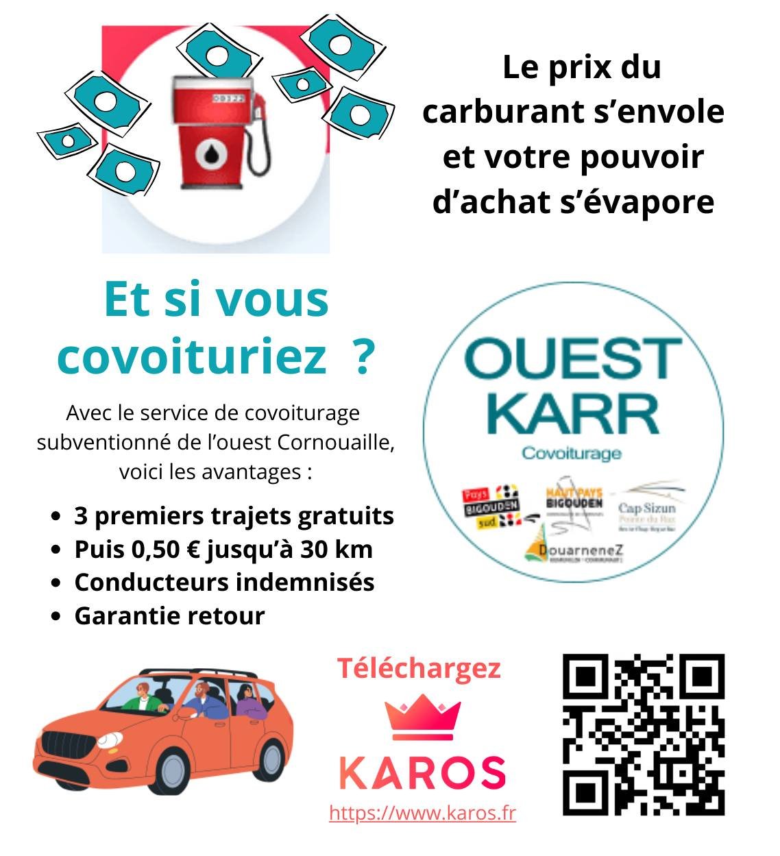 Toutes les infos sur OuestKarr, le service de covoiturage subventionné de l'ouest Cornouaille : https://www.sioca.fr/ouestkarr-covoiturage/ en partenariat avec Karos : https://karos.fr
