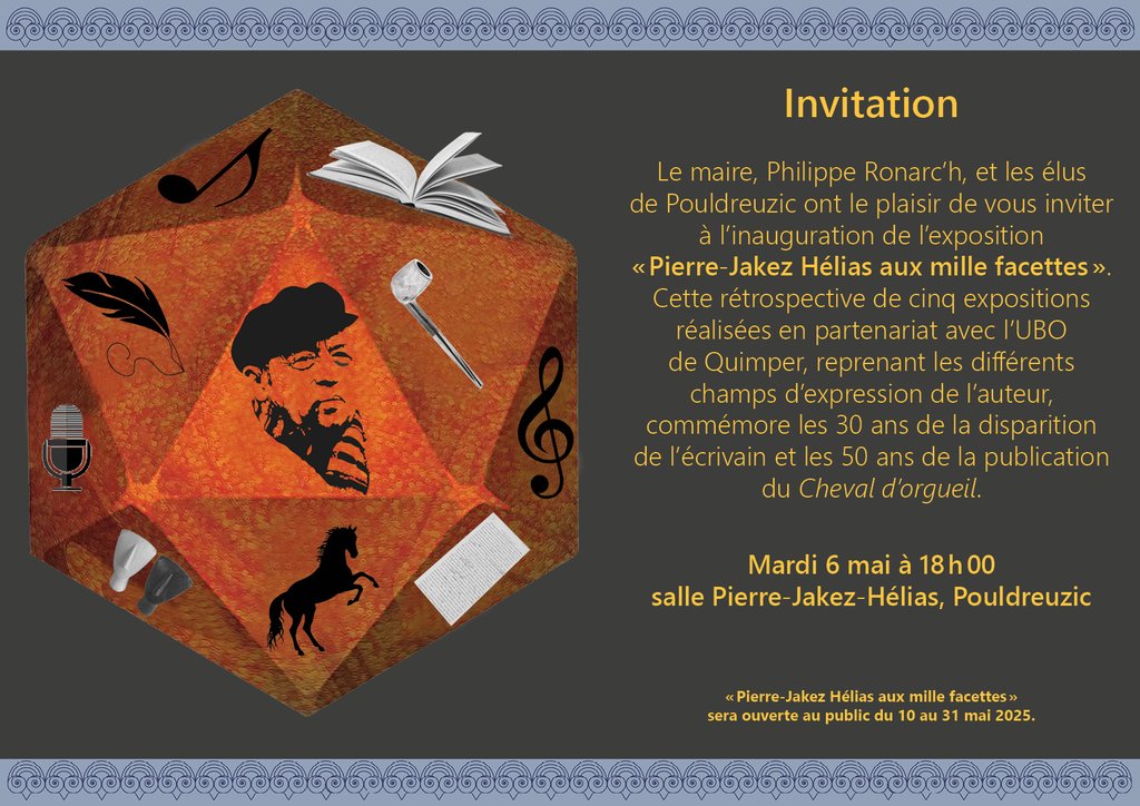 Le maire, Philippe Ronarc’h, et les élus de Pouldreuzic ont le plaisir de vous inviter à l’inauguration de l’exposition Pierre-Jakez Hélias aux mille facettes. Cette rétrospective de cinq expositions réalisées en partenariat avec l’UBO de Quimper, reprenant les différents champs d’expression de l’auteur, commémore les 30 ans de la disparition de l’écrivain et les 50 ans de la publication du Cheval d’orgueil.