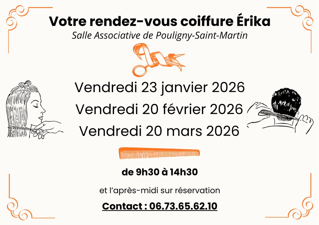 Le planning 1er trimestre 2026 est disponible, retrouvez votre coiffeuse Érika à la salle Associative de Pouligny-Saint-Martin !