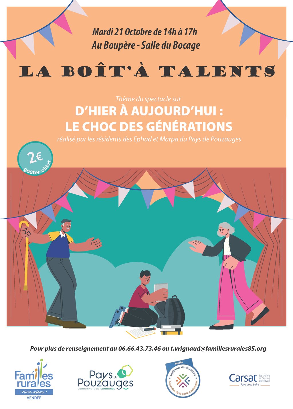 👴👵Les résidences pour personnes âgées (EHPAD et MARPA) du Pays de Pouzauges s'unissent pour proposer La Boît'à talents, un spectacle autour du thème : "D'hier à aujourd'hui, le choc des générations".
