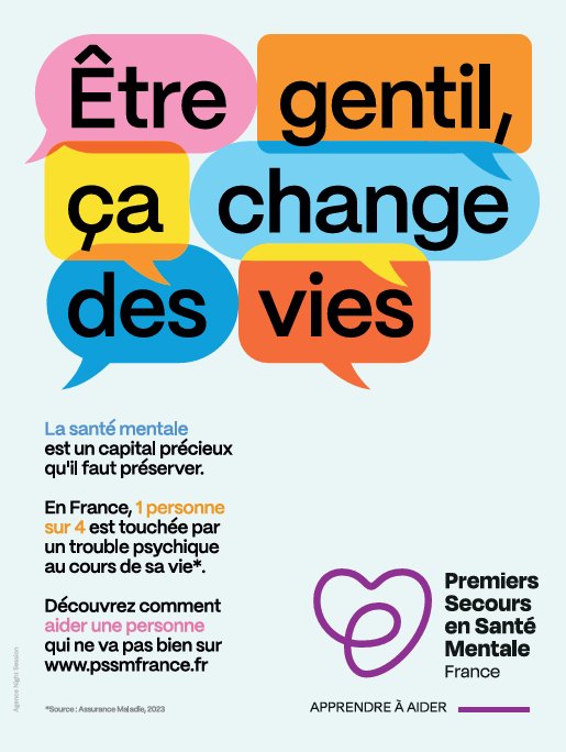 🫶 La Communauté de communes du Pays de Pouzauges s’associe à la campagne de communication nationale « Être gentil, ça change des vies », de l’association Premiers secours en santé mentale (PSSM) France. Cette association se donne pour objectif de lever le tabou autour de la santé mentale et de former 750 000 secouristes en santé mentale d’ici 2030.
