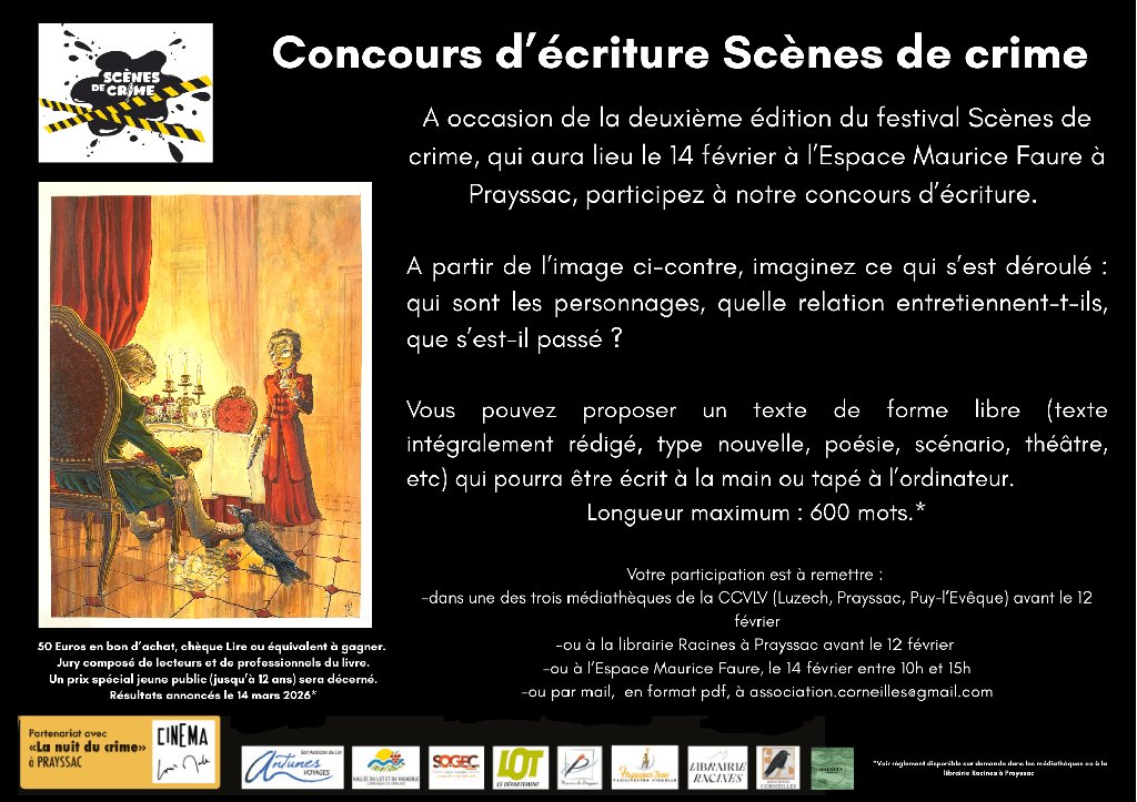 À l'occasion de la deuxième édition du festival Scènes de Crimes, qui se tiendra le 14 février à l'espace Maurice Faure, la bibliothèque de Prayssac vous propose un concours d'écriture en partenariat avec la librairie Racine.