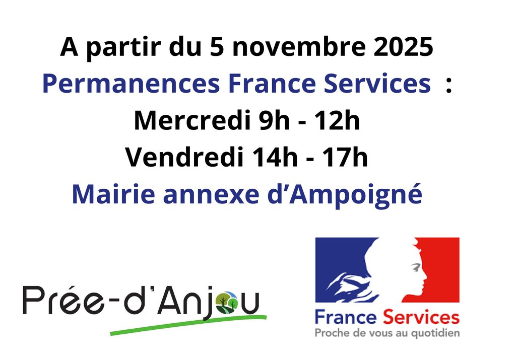 A partir du 5 novembre 2025, une conseillère France Services assurera des permanences à Prée-d'Anjou, au sein de la mairie déléguée d'Ampoigné les :