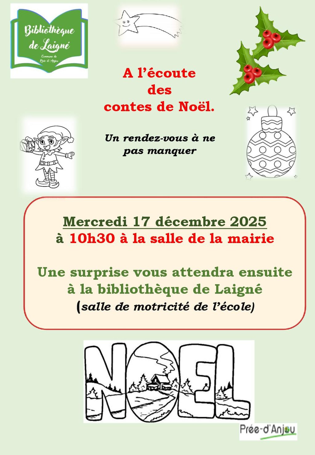 Une lecture de contes de Noël est organisée le 17 décembre 2025 par les bénévoles de la bibliothèque de Laigné.