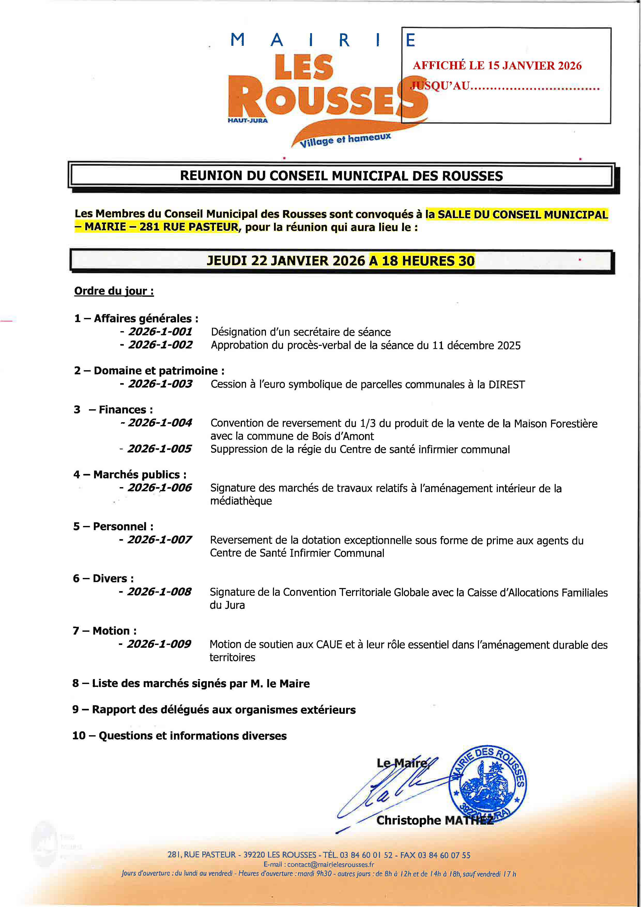 Le conseil municipal se réunira le jeudi 22 janvier à 18h30.