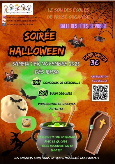 SOIRÉE HALLOWEEN AVEC LE SOU DES ECOLES DE PRISSÉ - SAMEDI 1ER NOVEMBRE 2025 DÈS 18H30