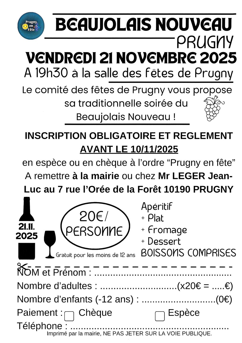 Le Comité des fêtes vous attend pour la soirée du BEAUJOLAIS NOUVEAU le 21 novembre 2025 à 19h30 dans la salle des fêtes.