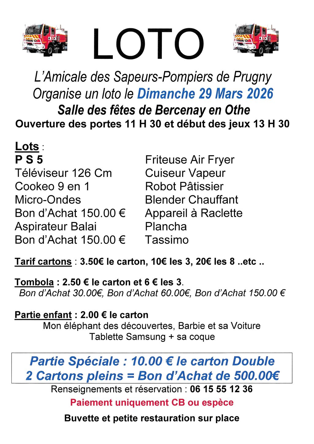 Le dimanche 29 mars 2026, les Pompiers de PRUGNY organisent un loto à la salle des fêtes de Bercenay en Othe.
