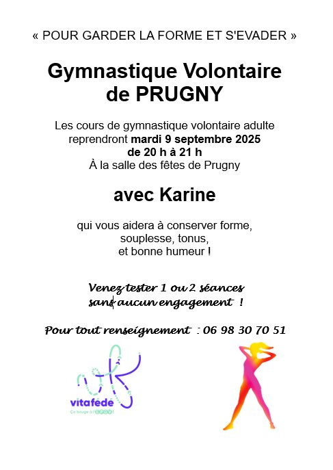 Cours de la gymnastique volontaire chaque mardi de 20h à 21h, dans la salle des fêtes de Prugny