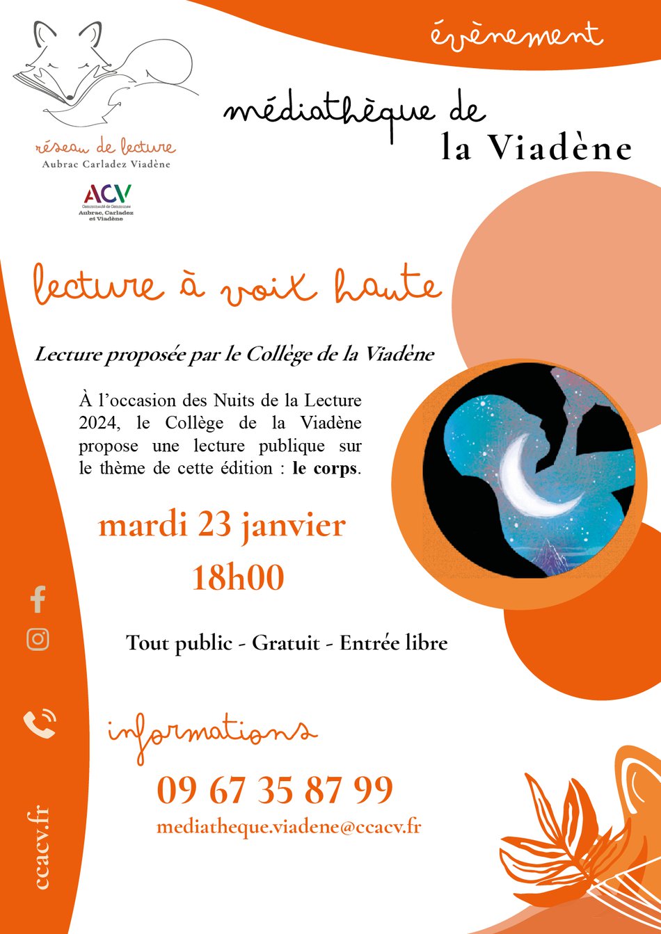 La semaine prochaine, à la médiathèque de la Viadène, venez profiter d'un temps de lecture à voix haute, proposé par le collège de la Viadène ! À l'occasion des Nuits de la Lecture 2024, le texte lu par les collégiens portera sur le thème du corps.