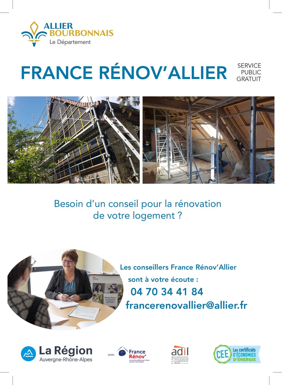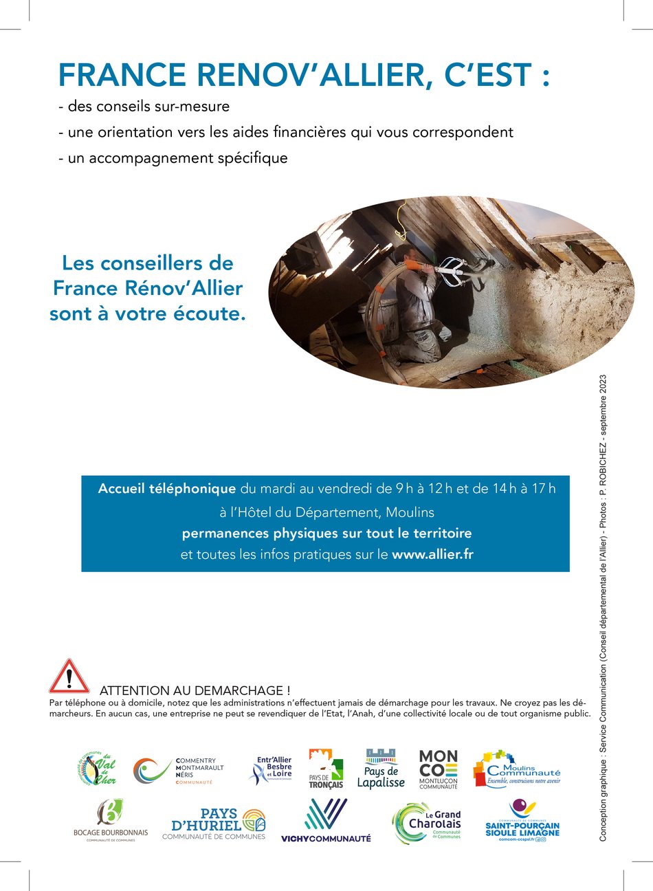 Les conseillers FranceRénov'Allier sont à votre écoute 😉, un accueil téléphonique 📞est mis en place du mardi au vendredi de 9h à 12h et de 14h à 17h à l'Hôtel du Département à Moulins-sur-Allier.