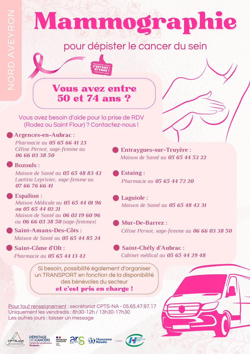 Dans le cadre d'Octobre Rose, la CPTS Nord Aveyron vous accompagne : elle aide à la prise de rendez-vous, et peut organiser une mobilité pour vous conduire à l'examen de dépistage à Rodez ou Saint-Flour.