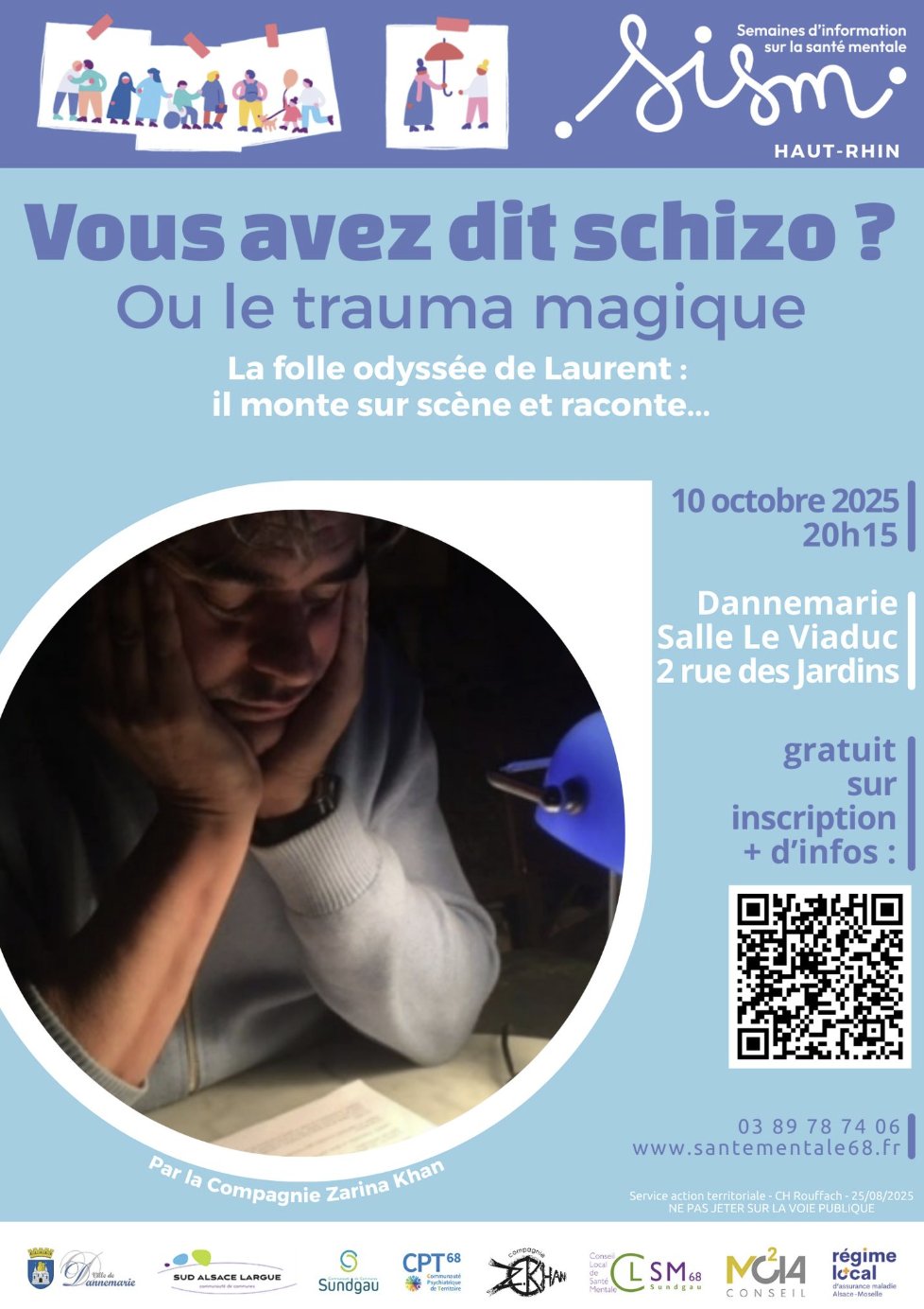 Dans le cadre du 3ème forum de la santé mentale, la pièce « Vous avez dit schizo ? Ou le trauma magique » sera présentée 𝐕𝐞𝐧𝐝𝐫𝐞𝐝𝐢 𝟏𝟎 𝐨𝐜𝐭𝐨𝐛𝐫𝐞 𝟐𝟎𝟐𝟓 à 20h15 : Un spectacle percutant pour partager un parcours de vie et questionner les représentations de la schizophrénie. Soirée tout public à partir de douze ans, gratuit et sur inscription sur www.santementale68.fr