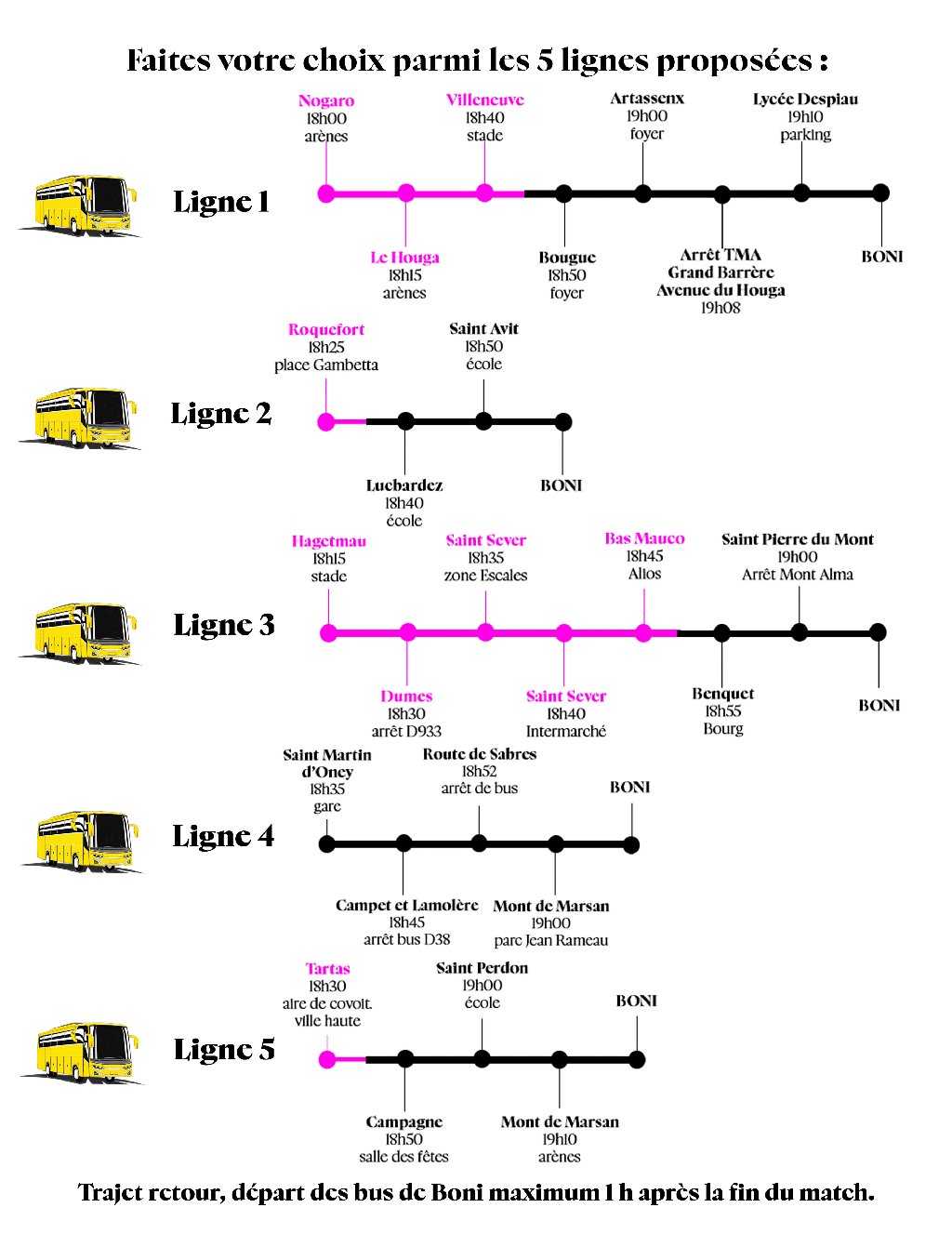 🏠 Vous habitez Saint Perdon et souhaitez assister aux matchs à domicile du Stade Montois Rugby ? Optez pour l'un de nos Boni’Bus pour venir au Stade en toute simplicité et en toute sécurité !