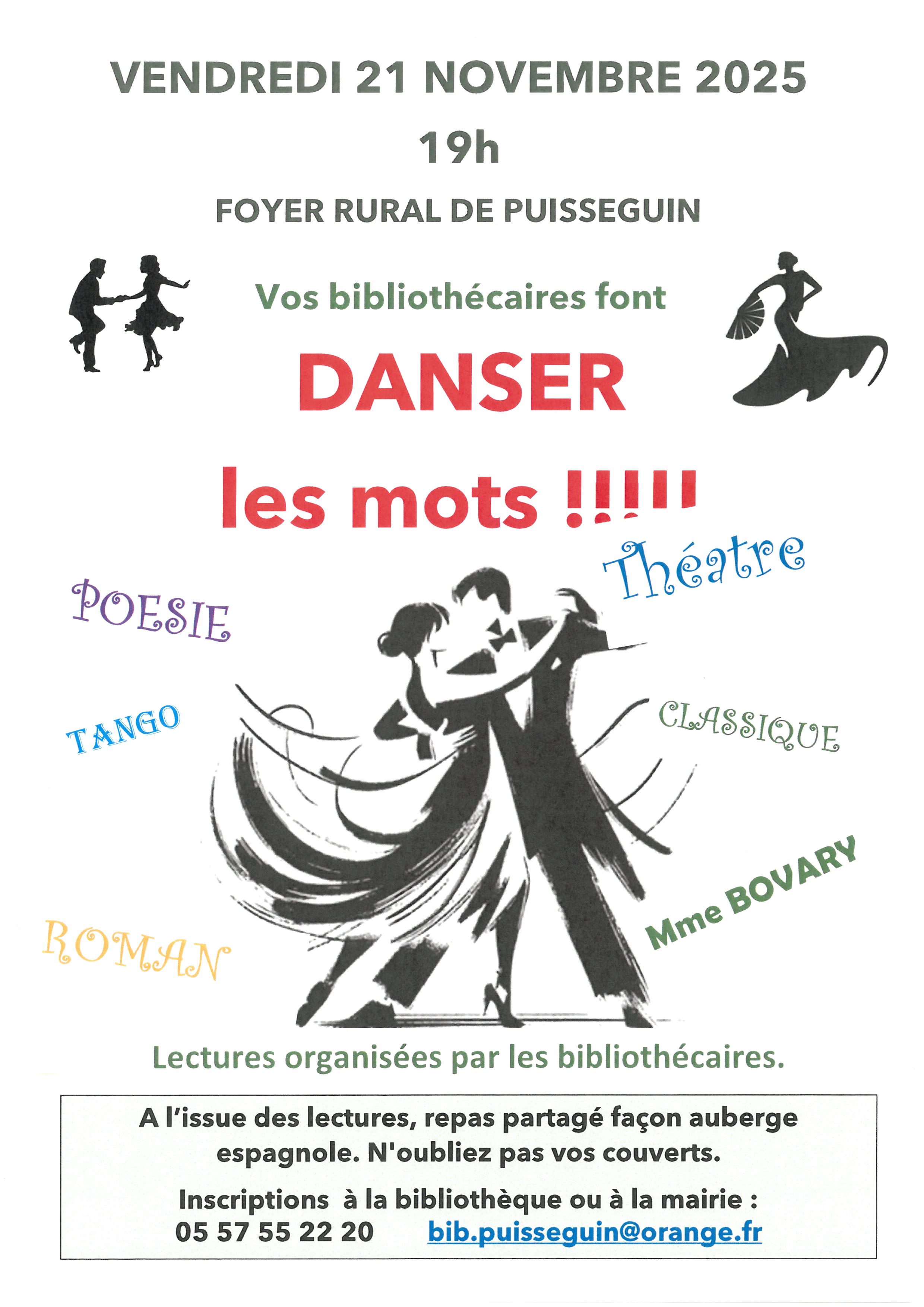 Les bibliohécaires de Puisseguin vous invitent à la soirée lectures organisée le vendredi 21 novembre 2025 à 19 h 00 au Foyer Rural.