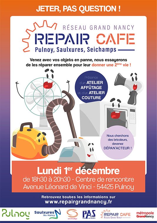 Les répar'acteurs du Repair café Pulnoy-Saulxures-Seichamps vous donnent rendez-vous lundi prochain, au centre de rencontre, à partir de 18h30.
