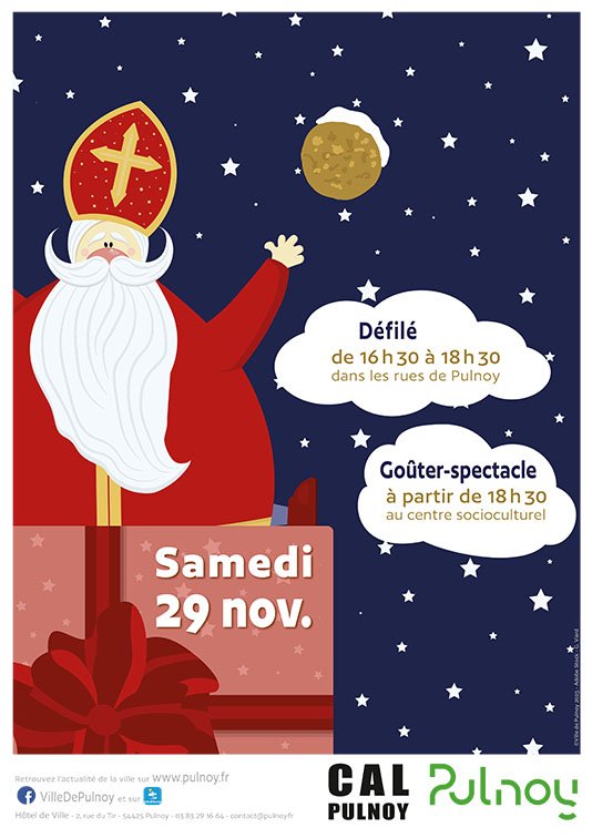Le Comité Animations et Loisirs (CAL) et la Ville de Pulnoy vous invitent à venir assister au défilé et au goûter-spectacle offerts aux Pulnéennes et Pulnéens à l'occasion des festivités de la St Nicolas.