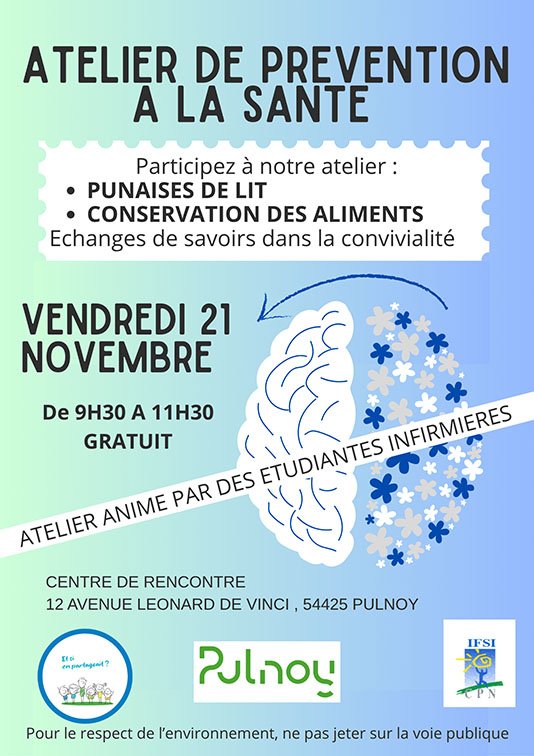 Dans le cadre de son programme d'animation intergénérationnel Et si on partageait ?, la Ville de Pulnoy propose un atelier de prévention santé consacré aux punaises de lit et à la conservation des aliments, animé par des étudiantes infirmières.