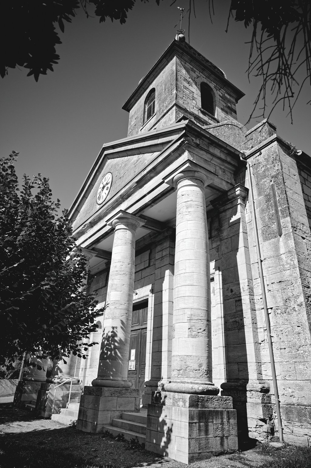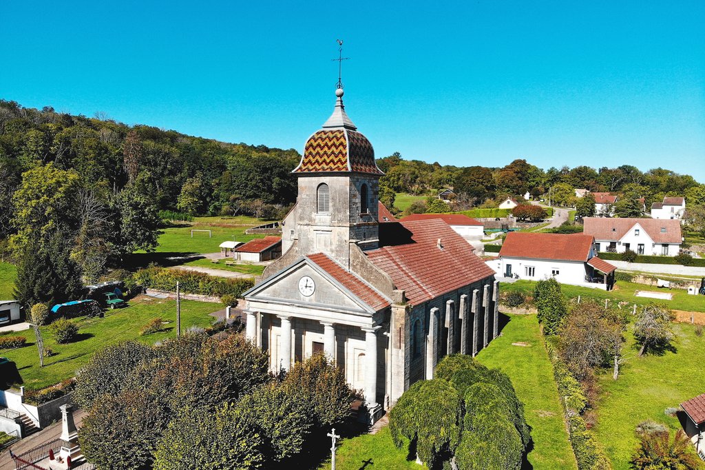 Elle fut déplacée et reconstruite dans les années 1780. La large façade présente un grand portique de quatre colonnes doriques trapues, en forme de temple, à fronton triangulaire construit en 1831. Clocher-porche à toit bulbeux avec deux cloches de 1784 et 1861 ; celle baptisée en 1784, a pour parrain, Charles Roger Prince de Bauffremont, et pour marraine, Marie Françoise de Charnage, épouse de Philibert Foillenot de Magny, conseillé au parlement de Besançon.