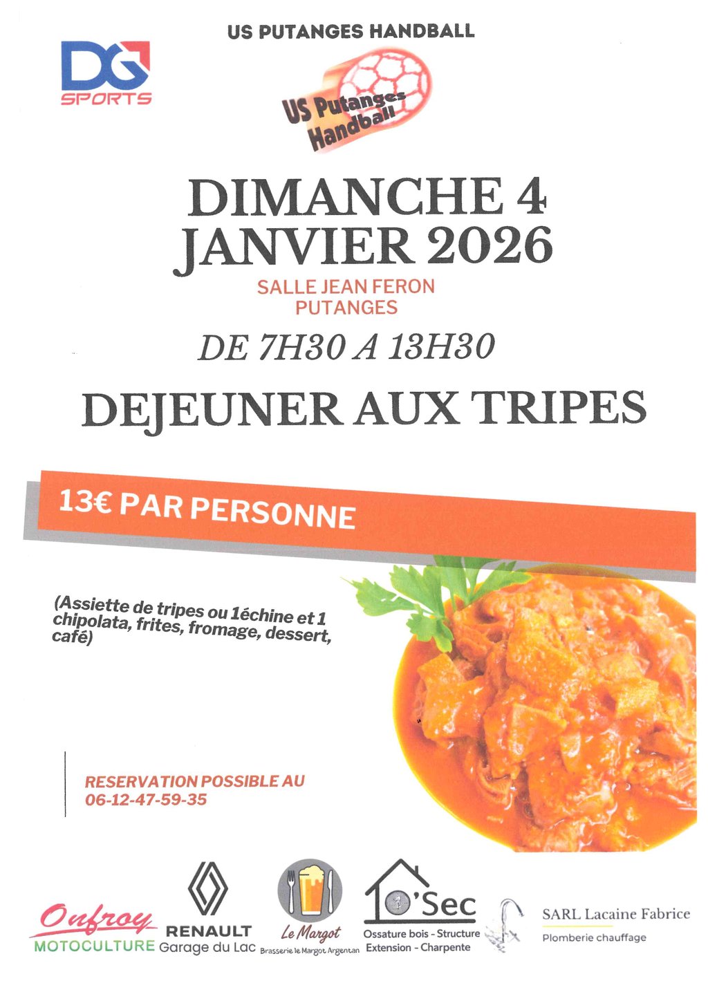 L'USP Handball organise un déjeuner aux tripes le dimanche 4 janvier : Assiette de tripes ou 1 échine et une chipolata, frites, fromage, dessert, café.
