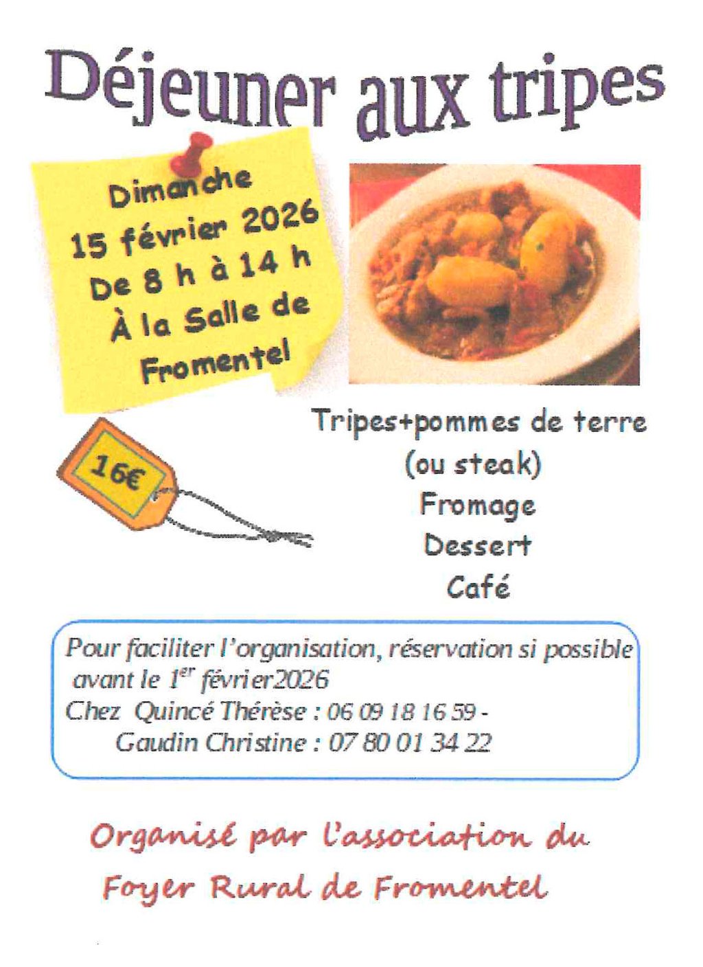 Rendez-vous le dimanche 15 février 2026 pour un déjeuner aux tripes, à la salle de Fromentel.