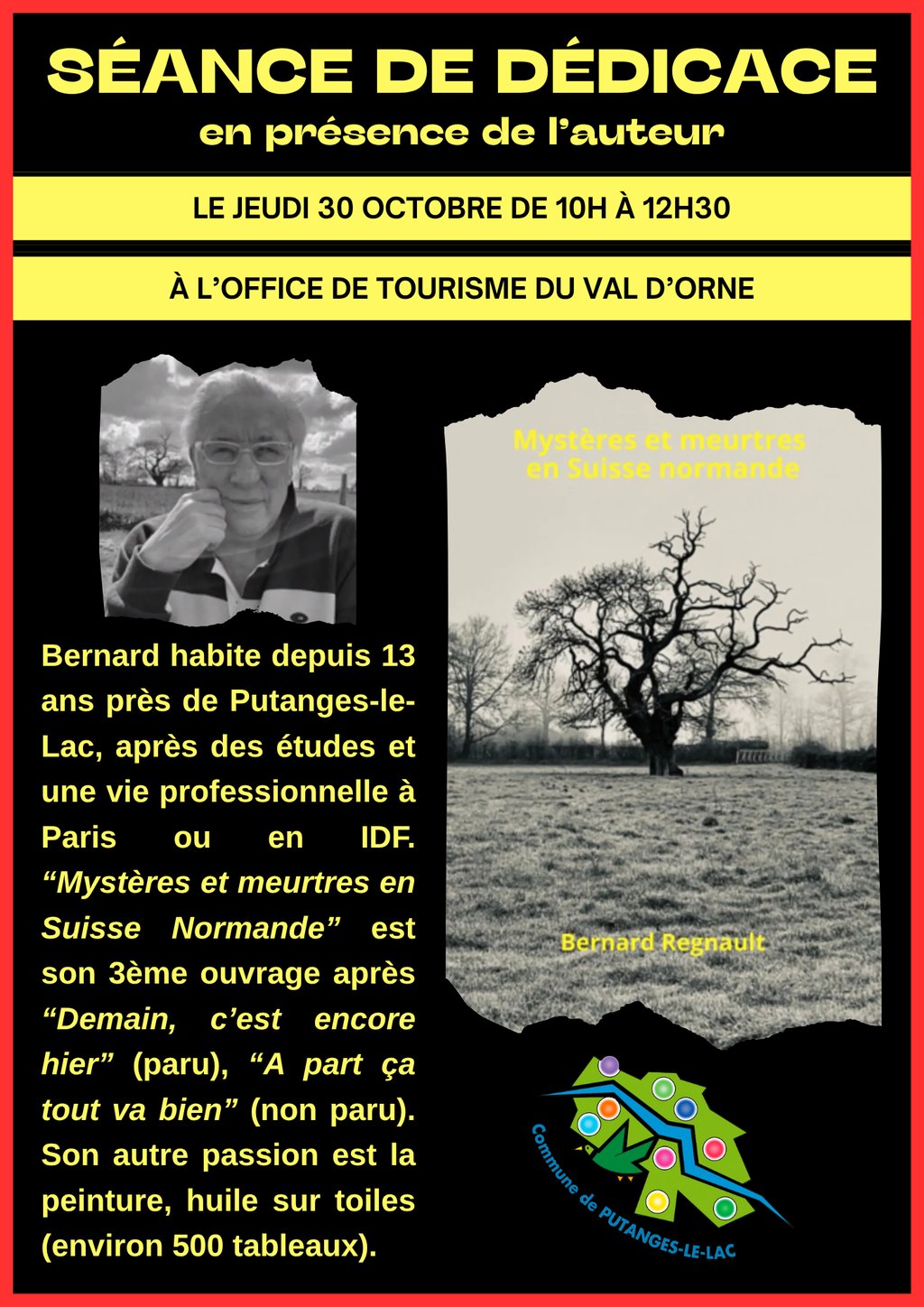 Bernard habite depuis 13 ans près de Putanges-le-Lac, après des études et une vie professionnelle à Paris ou en IDF. “Mystères et meurtres en Suisse Normande” est son 3ème ouvrage après “Demain, c’est encore hier” (paru), “A part ça tout va bien” (non paru). Son autre passion est la peinture, huile sur toiles (environ 500 tableaux).
