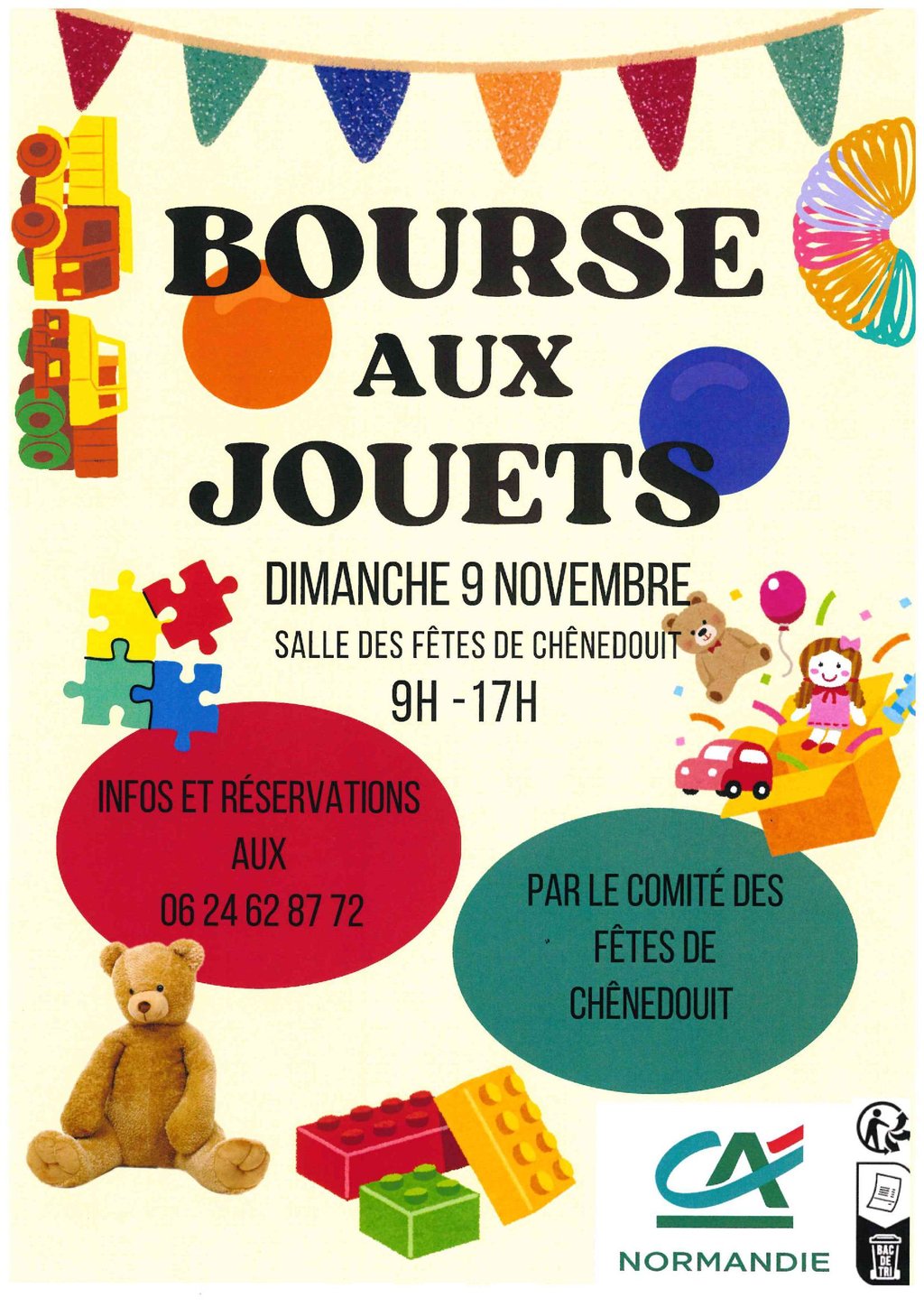 Le comité des fêtes de Chênedouit organise, le dimanche 9 novembre prochain, une bourse aux jouets à la salle des fêtes de Chênedouit.