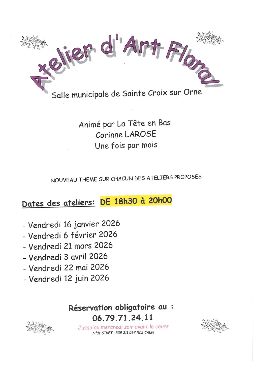 Atelier d'Art Floral animé par Corinne LAROSE, "La Tête en Bas". Réservation obligatoire au 06 79 71 24 11 (jusqu'au mercredi soir avant le cours)
