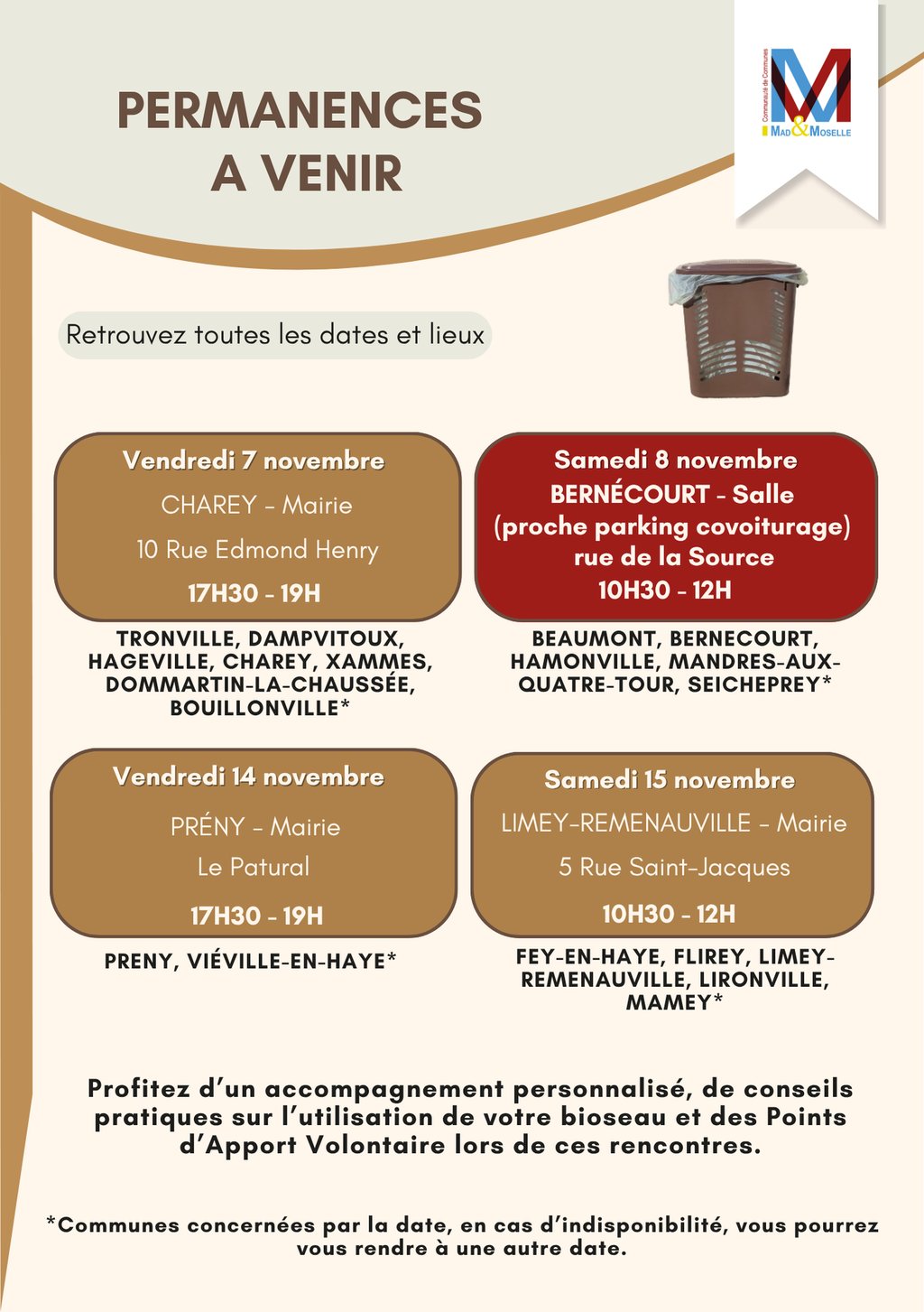 La permanence prévue samedi 8 novembre à Bernécourt n’aura pas lieu en salle des fêtes, mais dans la salle située rue de la Source, au niveau du parking de covoiturage.