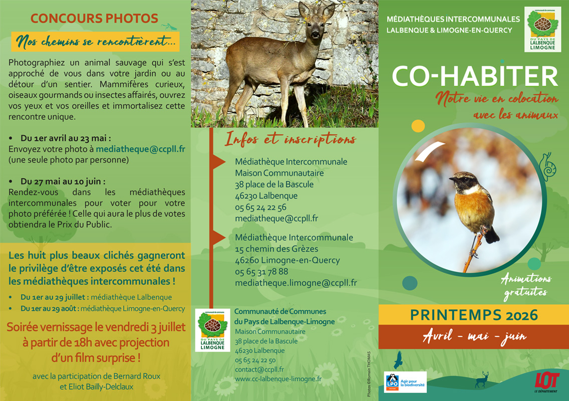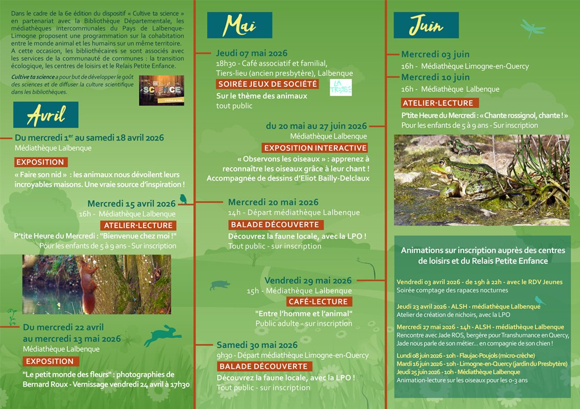 Dans le cadre de la 6e édition du dispositif « Cultive ta science » en partenariat avec la Bibliothèque Départementale, les médiathèques intercommunales du Pays de Lalbenque-Limogne proposent une programmation sur la cohabitation entre le monde animal et les humains sur un même territoire.A cette occasion, les bibliothécaires se sont associés avec les services de la communauté de communes : la transition écologique, les centres de loisirs et le Relais Petite Enfance.