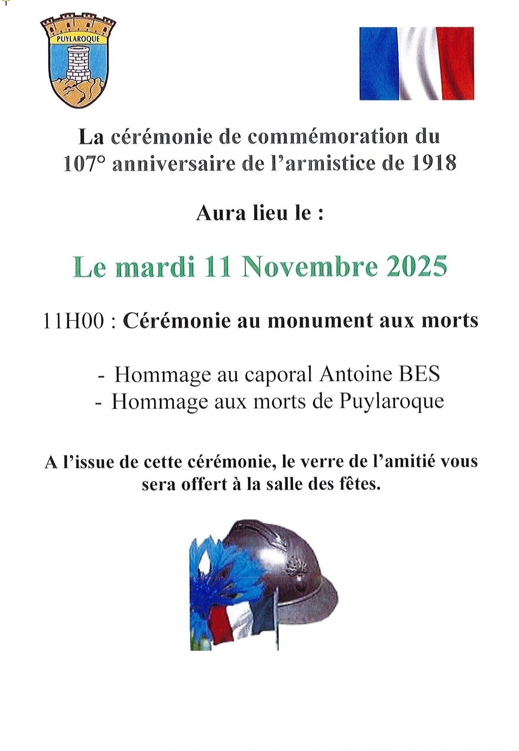 La cérémonie aura lieu au monument aux morts de Puylaroque à 11h00.