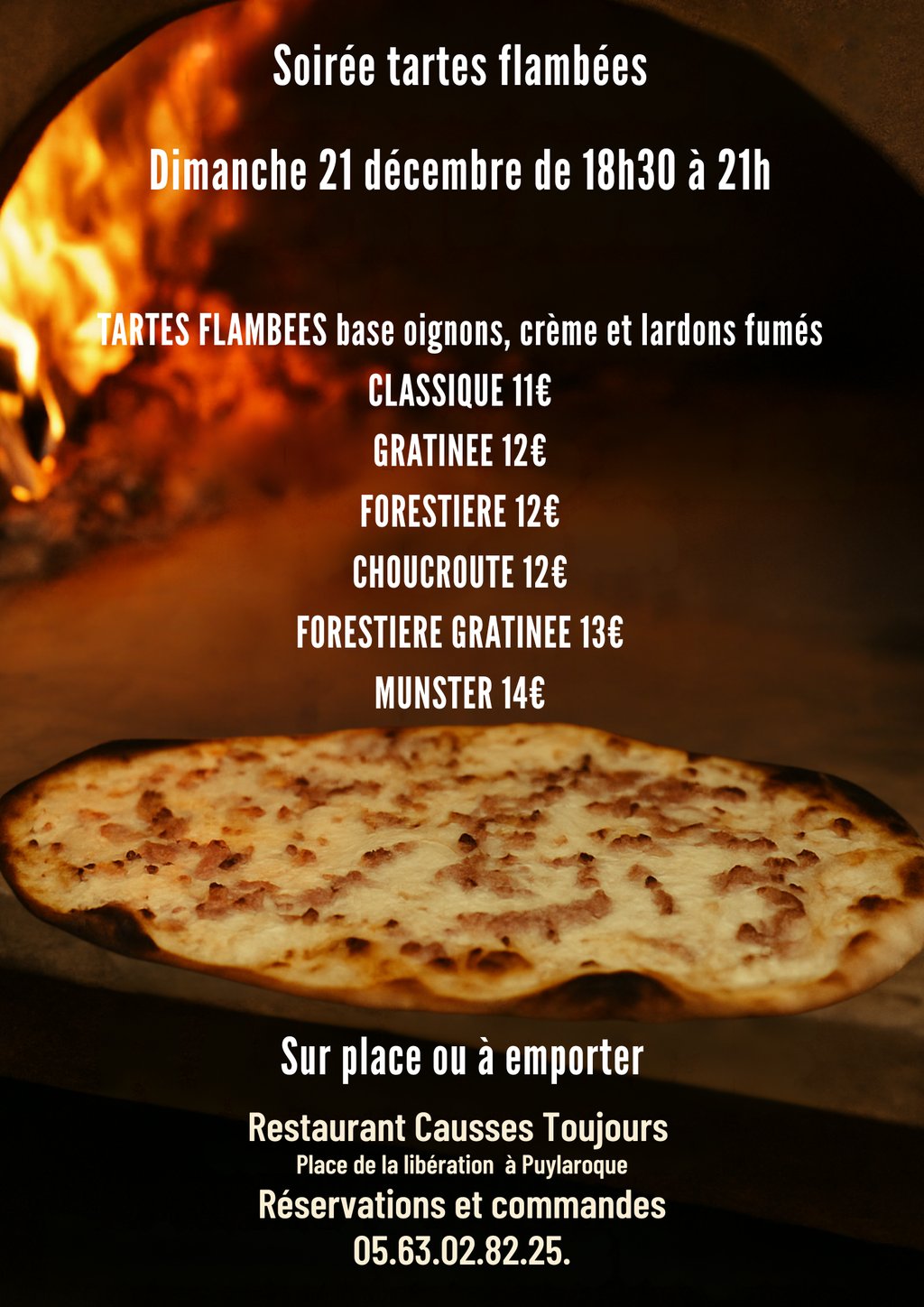 Dimanche 21 décembre. Flammekueche au feu de bois, sur place ou à emporter de 18h30 à 21h.