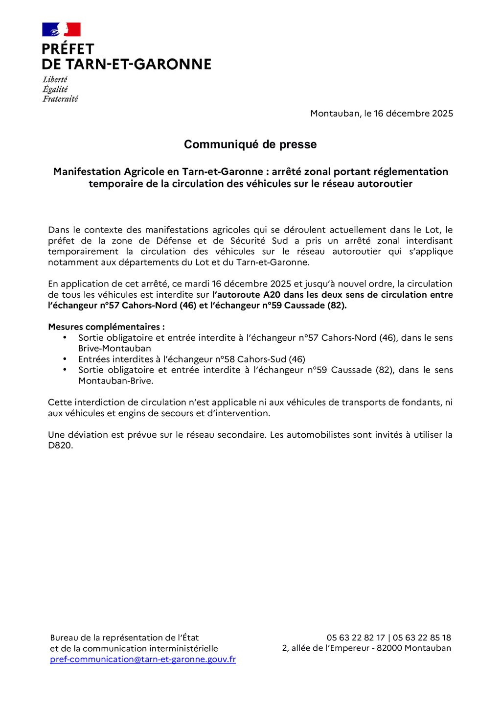 En application de cet arrêté, ce mardi 16 décembre 2025 et jusqu’à nouvel ordre, la circulation de tous les véhicules est interdite sur l’autoroute A20 dans les deux sens de circulation entre l’échangeur n°57 Cahors-Nord (46) et l‘échangeur n°59 Caussade (82).