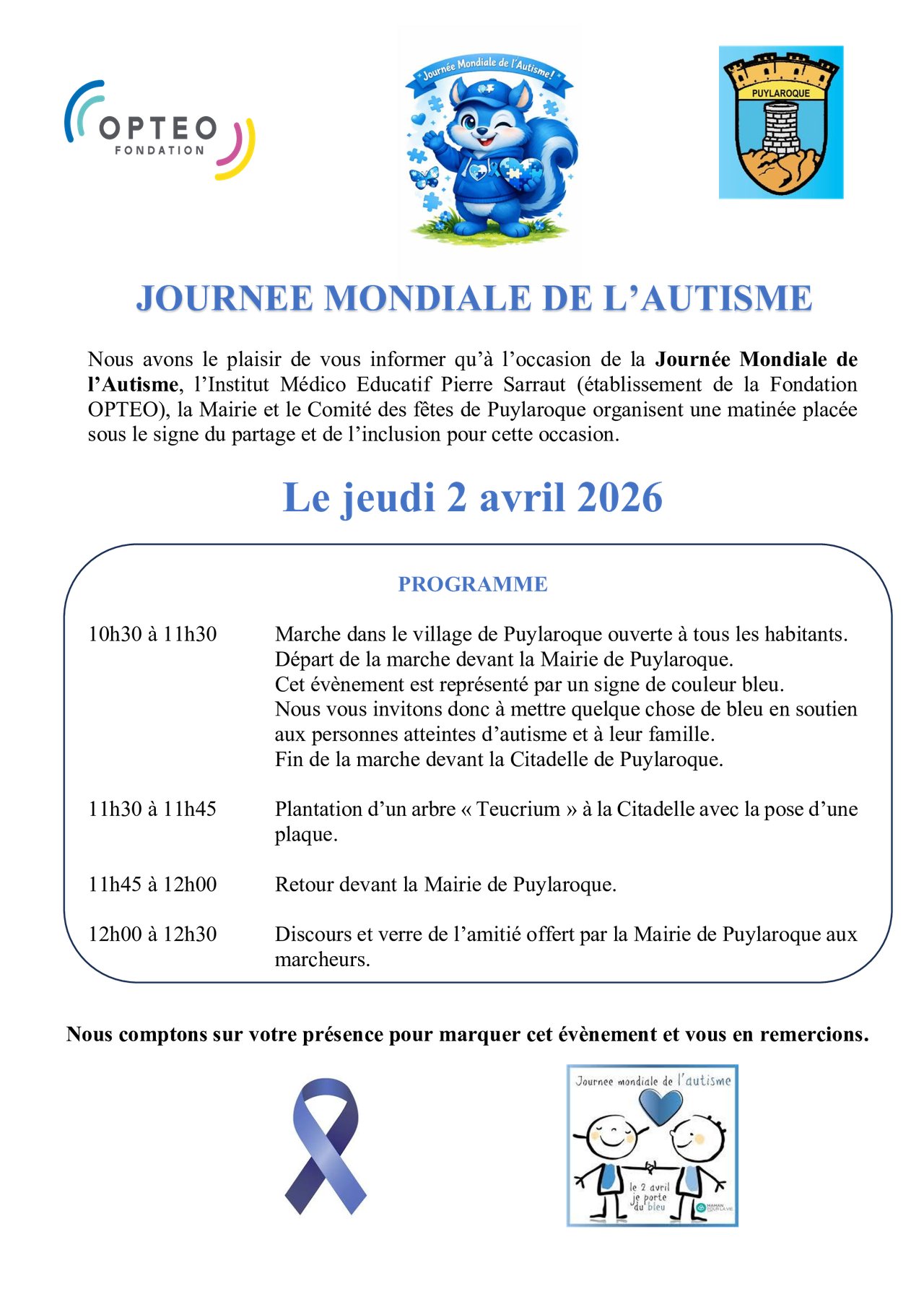 10h30 à 11h30 11h30 à 11h45 Marche dans le village de Puylaroque ouverte à tous les habitants. Départ de la marche devant la Mairie de Puylaroque. Cet évènement est représenté par un signe de couleur bleu. Nous vous invitons donc à mettre quelque chose de bleu en soutien aux personnes atteintes d’autisme et à leur famille.