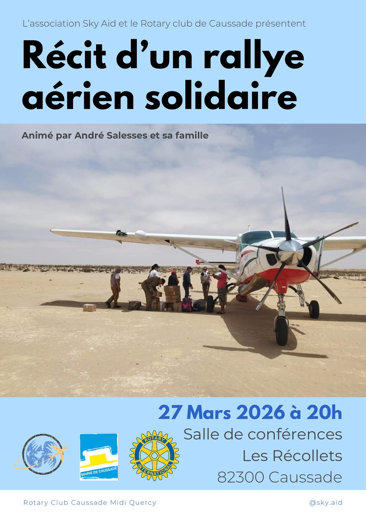 En étroite collaboration avec le Rotary Club Caussade Midi-Quercy et son Président Pascal Magne, nous avons le plaisir de vous inviter à une conférence exceptionnelle dédiée au déroulement de notre aventure aérienne et humanitaire, vendredi 27 mars à 20h, à Caussade dans la salle des conférences aux Récollets, animée par André Salesses et sa famille.