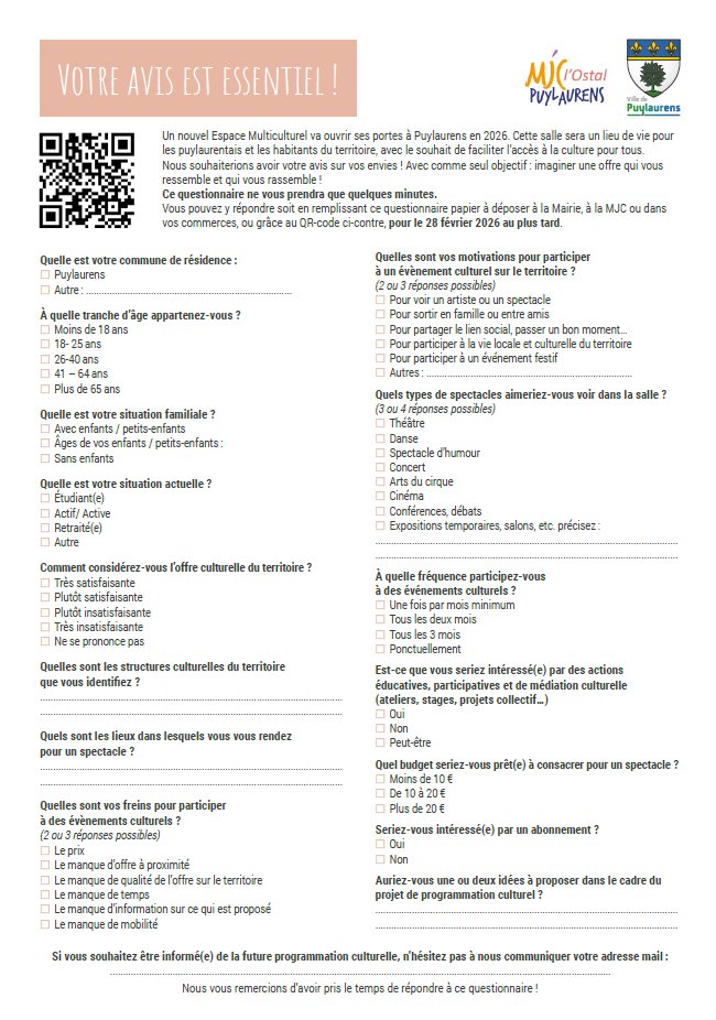 Aussi, en partenariat avec la MJC de Puylaurens et la Fédération des MJC, nous avons travaillé sur ce questionnaire, pour mieux connaître vos habitudes, vos besoins et vos souhaits.