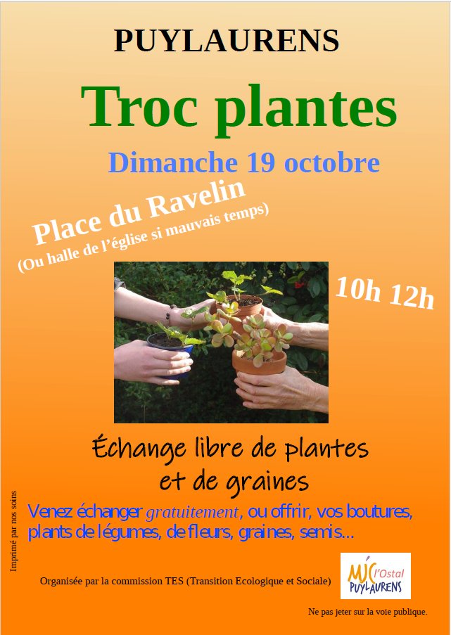 Venez échanger gratuitement, offrir vos plantes et vos graines, dimanche 19 octobre, place du Ravelin, à Puylaurens (ou sous la Halle de l'église, en cas de pluie).