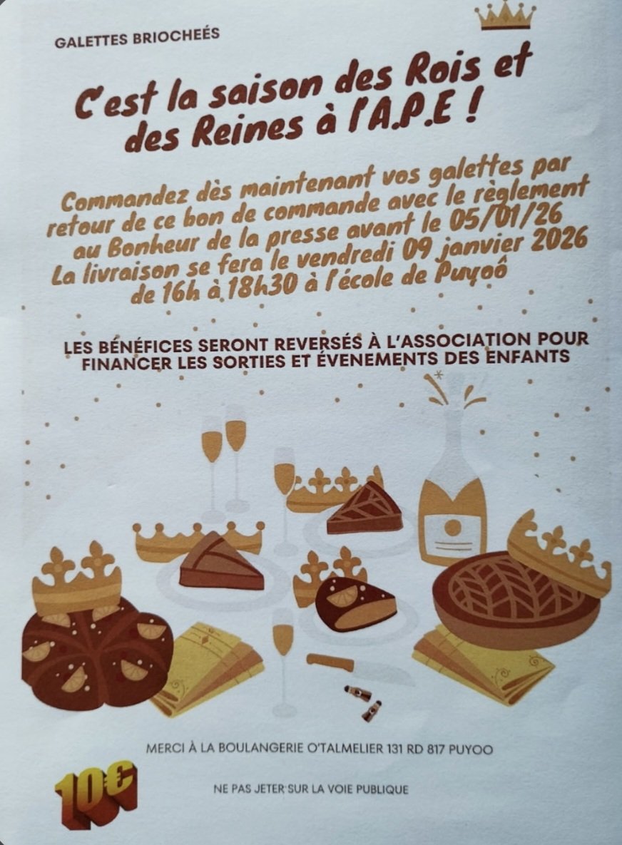 Les fêtes continuent après les fêtes ! Commandez votre Galette des Rois 🫅 (brioche, O'Talmelier) avant le 5 janvier, les bénéfices seront reversés à l'APE RPI Puyoo Ramous !