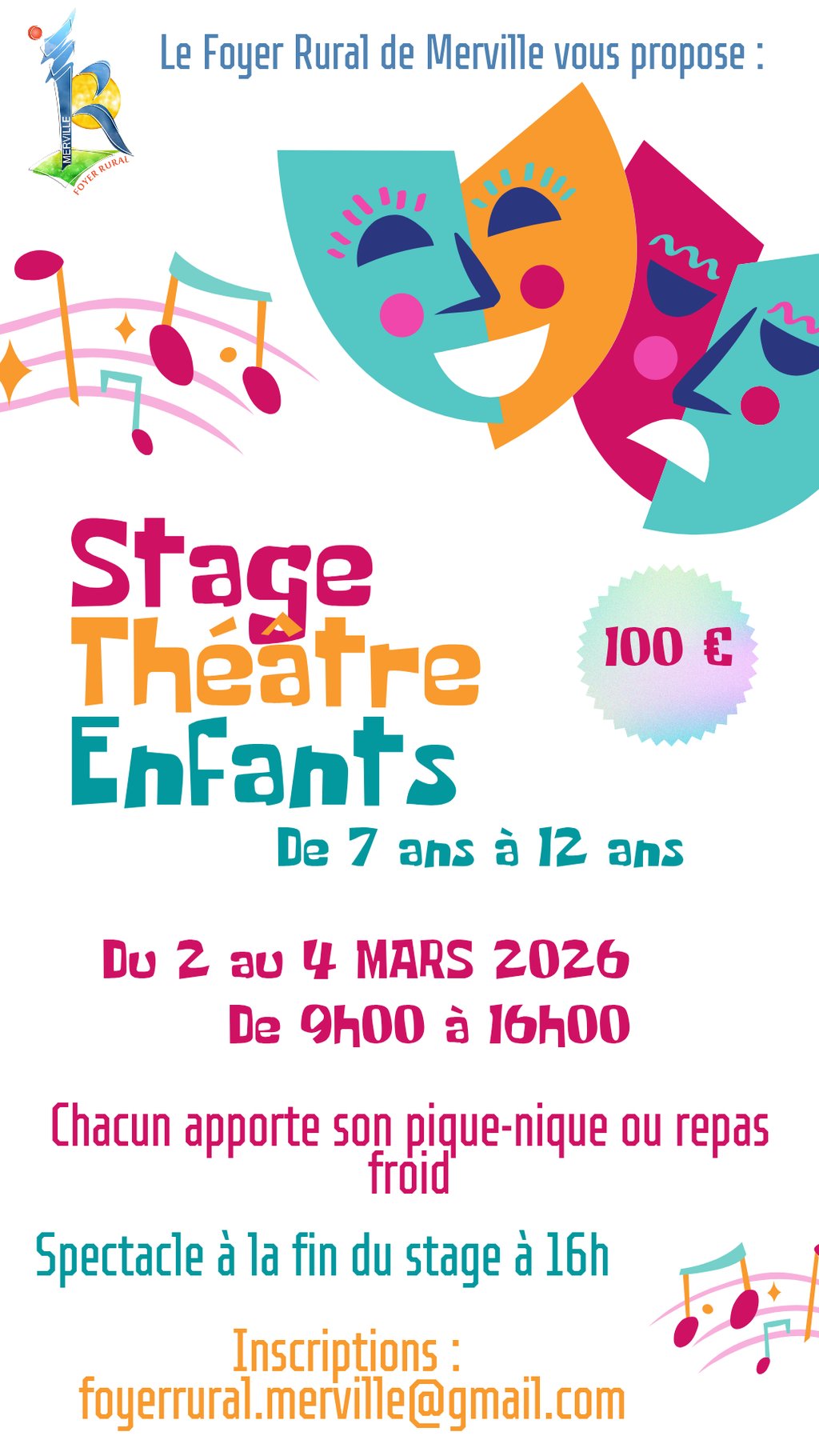 Du 2 au 4 Mars, le Foyer Rural proposera un stage de théâtre pour les 7-12 ans à Naudin le lundi / mardi et Joseph Bon le mercredi. Un spectacle aura lieu le dernier jour à 16h. Inscriptions par mail auprès du Foyer Rural. Coût de 100€. Chacun apporte son pique nique ou repas froid.