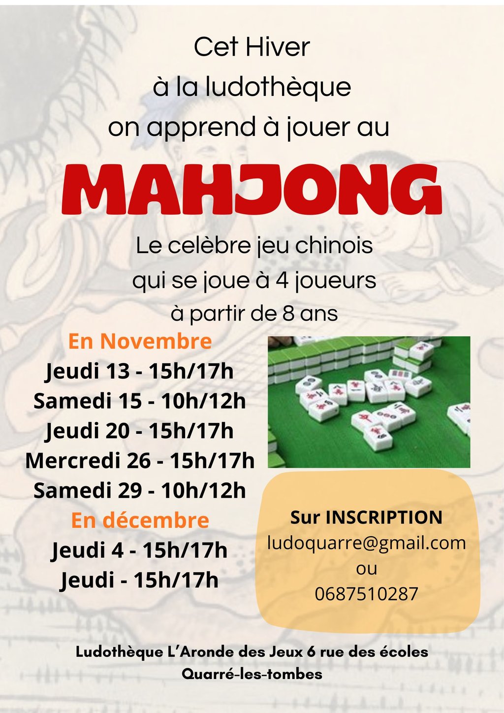 La Ludothèque de Quarré-les-tombes vous propose plusieurs séances d'initiation au jeu de MAHJONG