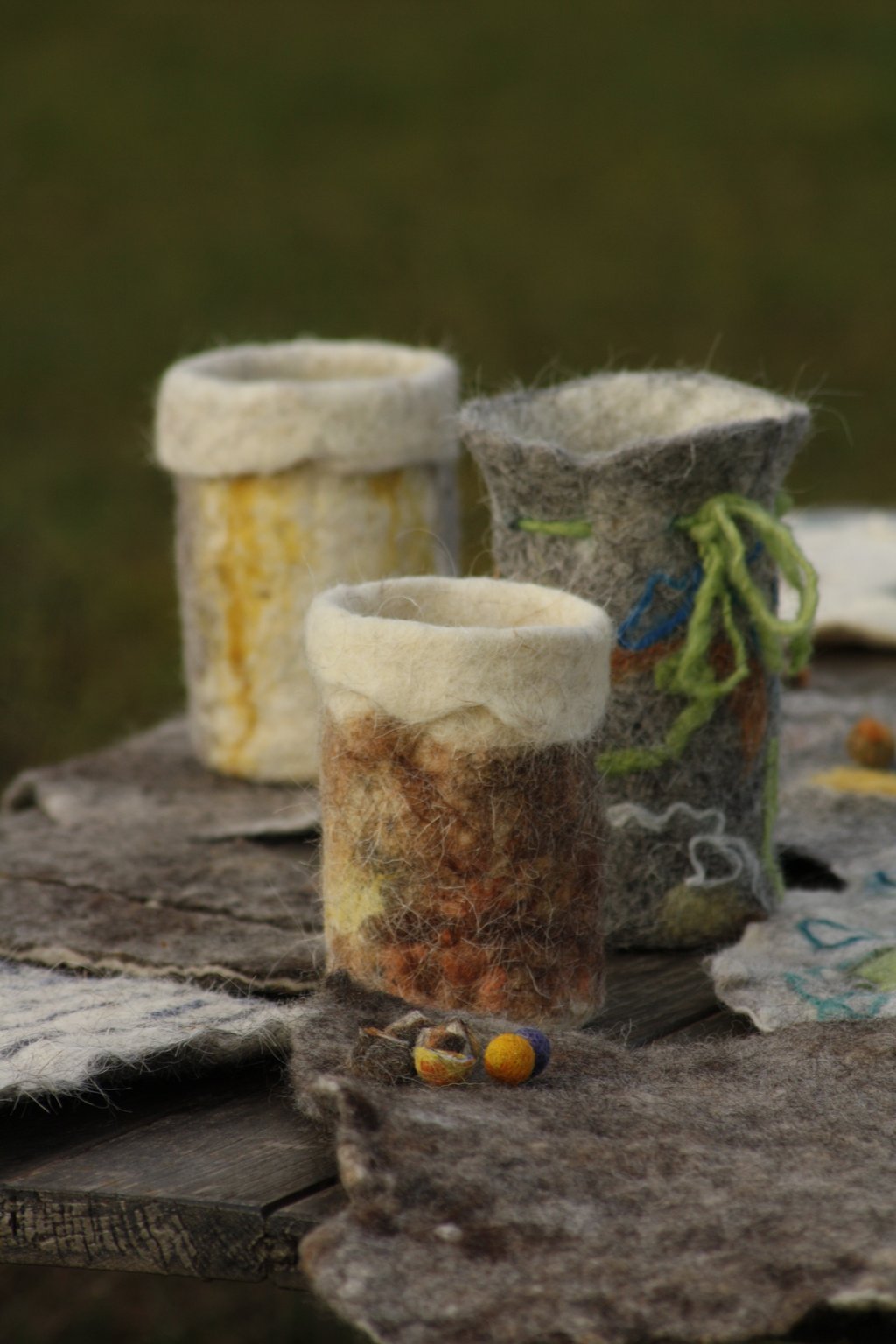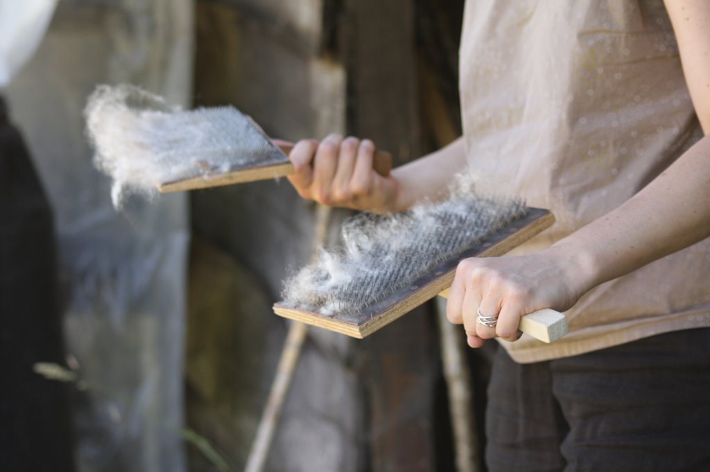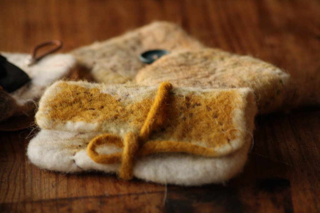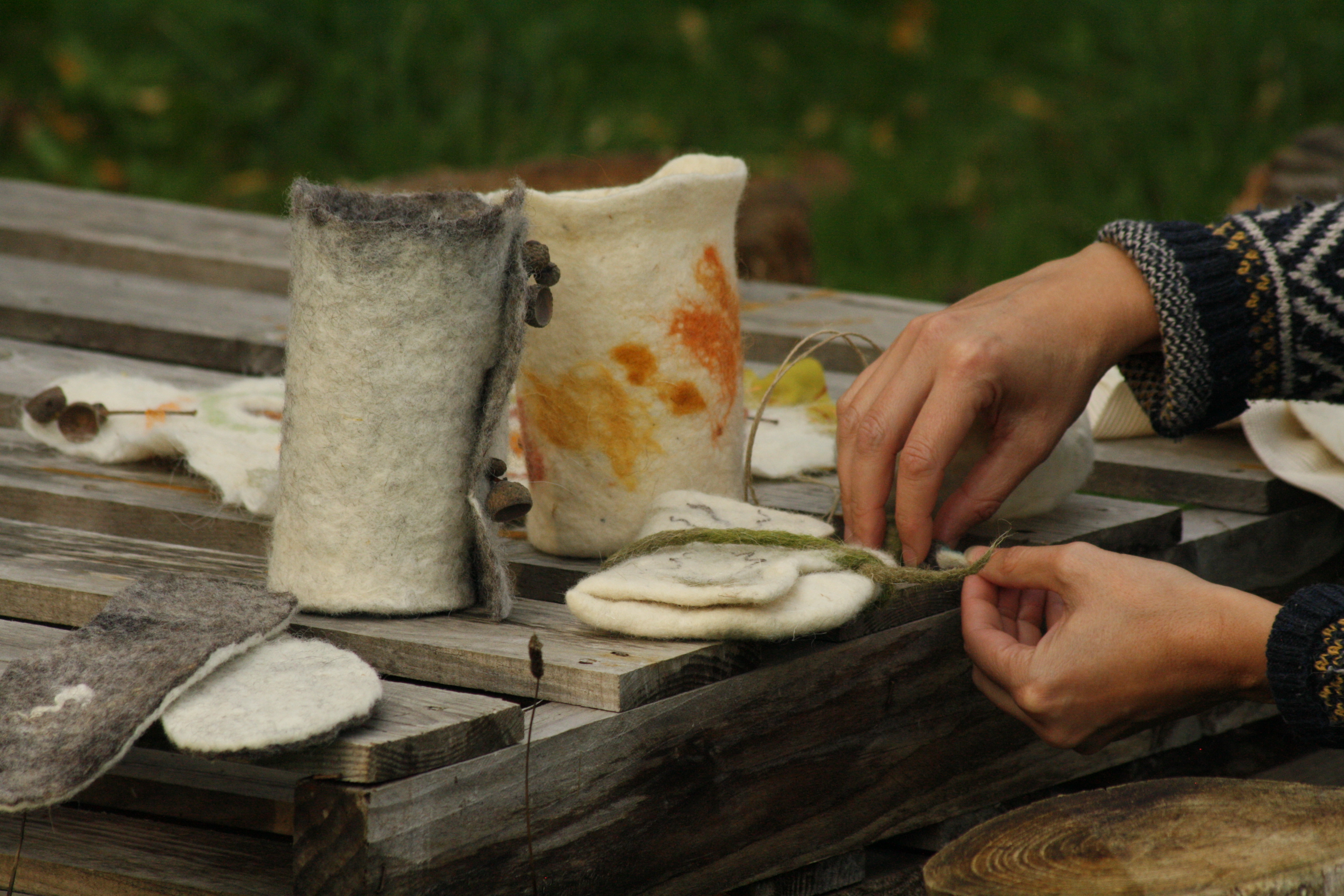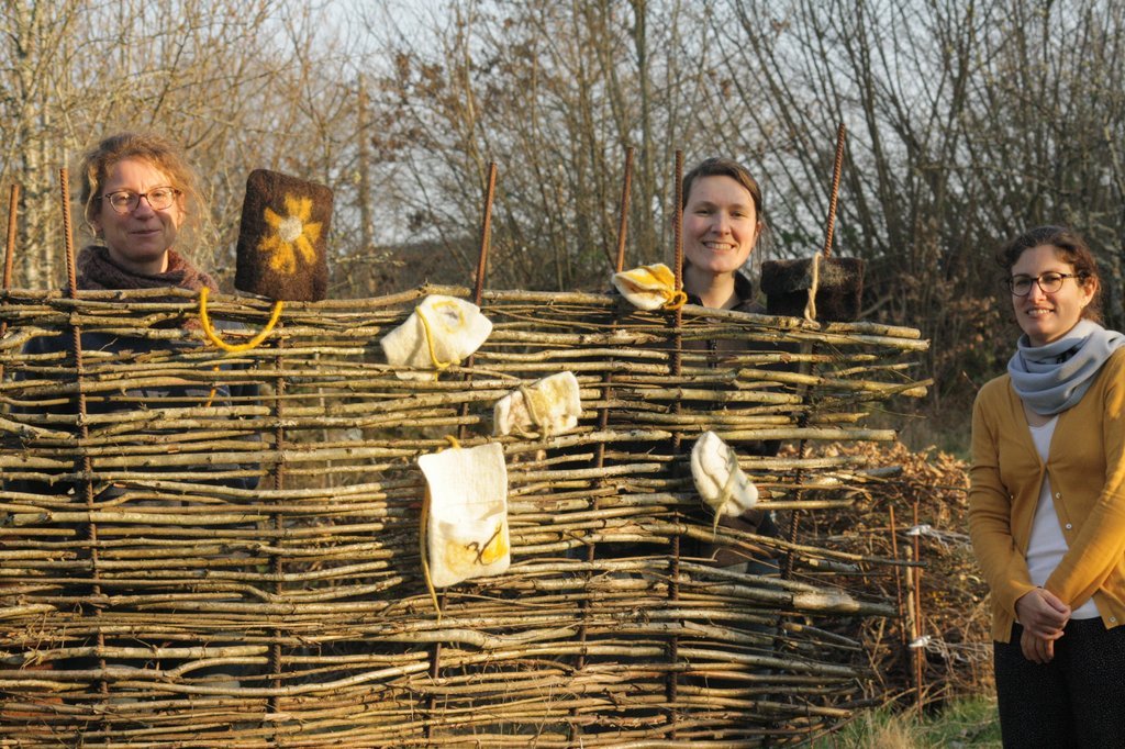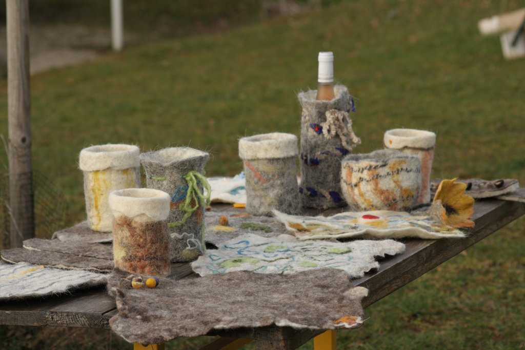 Découverte des propriétés de la laine, préparation, cardage et feutrage d'une pochette. Inclusion de reliefs et matières (tissus, cordelettes, ...). Feutrage à la main. Travail avec de la laine de moutons locaux et teintures végétales.
