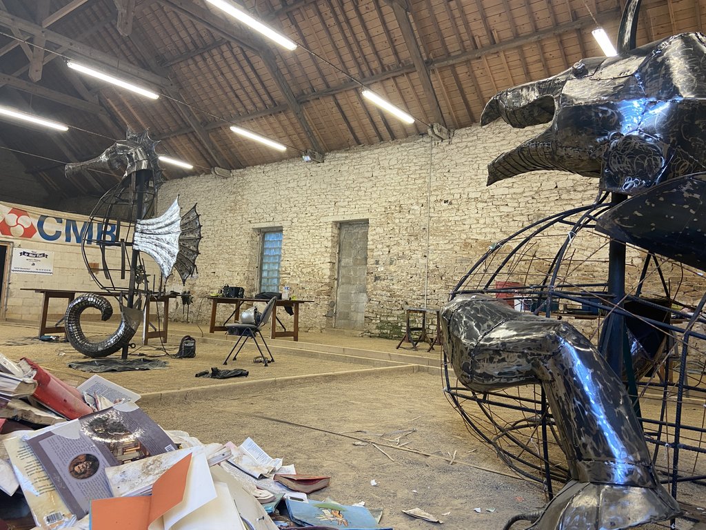 Jean-Michel Rubio et Yalouk sont de retour à Questembert pour retravailler deux de leurs œuvres, la Dragonne et l’Hippocampe, afin de les habiller et de les rendre "pérennes".