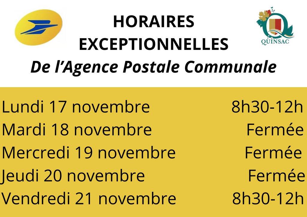 La semaine du 17 au 21 novembre, l'agence postale modifie exceptionnellement ses horaires d'ouverture.