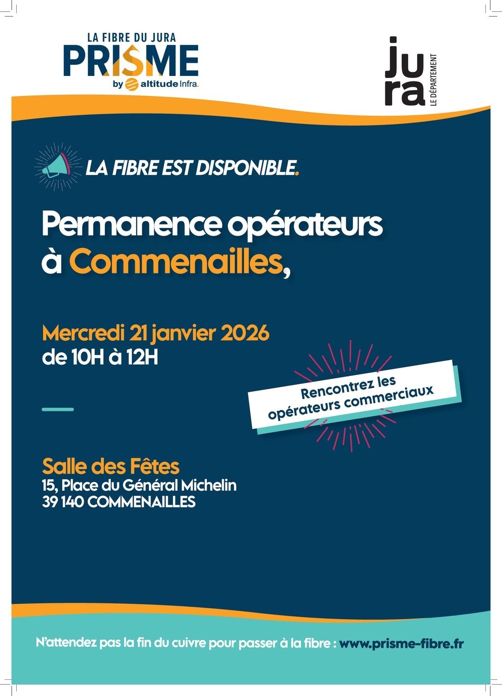 Prisme, l'opérateur chargé par le département du déploiement de la fibre sur notre secteur, organise à Commenailles le mercredi 21 janvier de 10h à 12h (à la salle des fêtes) une permanence ouverte à tous les habitants du village.
