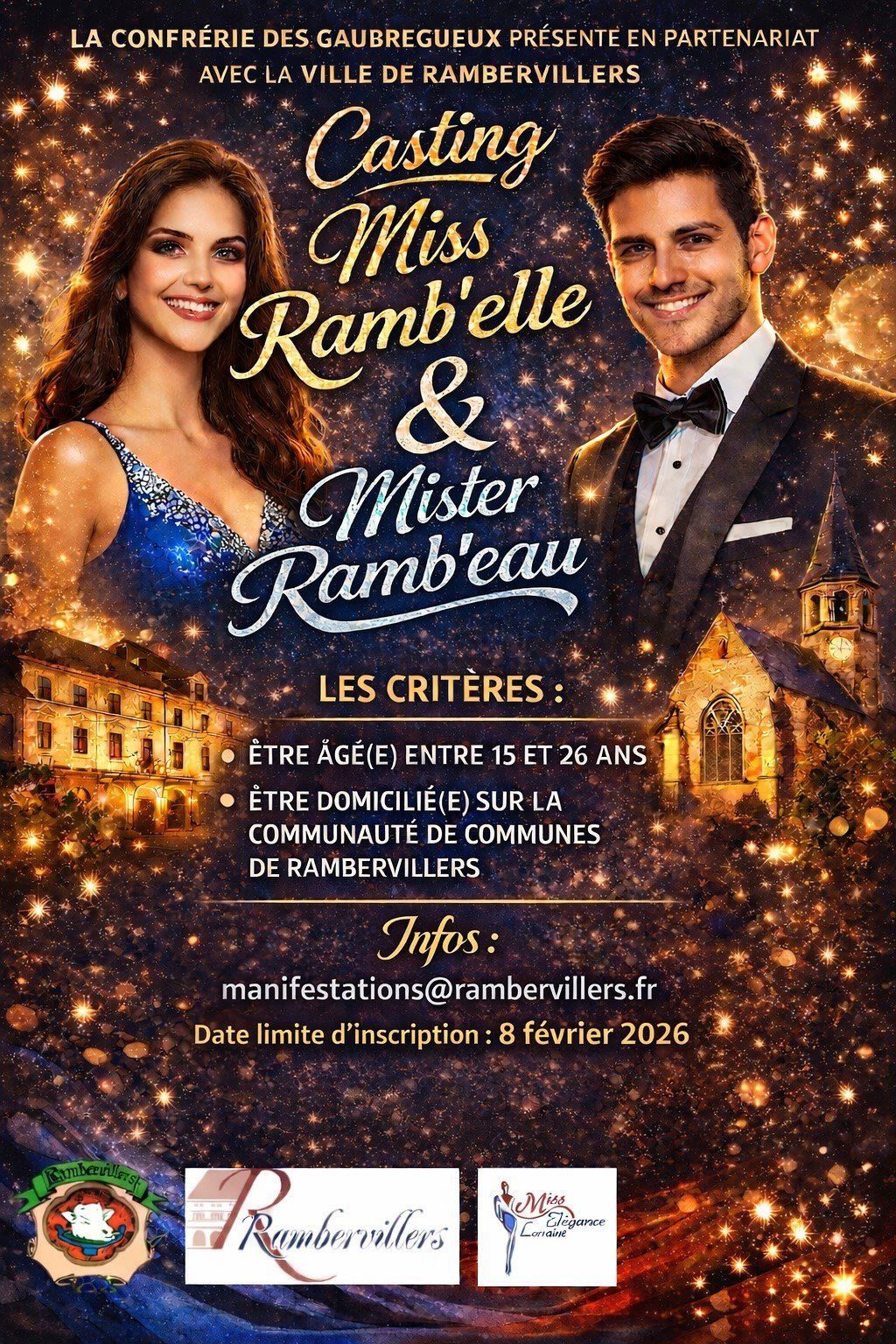 La Confrérie des Gaubregueux Gousteurs de Testes de Veau de Rambervillers, avec le soutien de la Ville de Rambervillers et des commerçants locaux, lance un tout nouveau concours : Miss Ramb’elle & Mister Ramb’eau