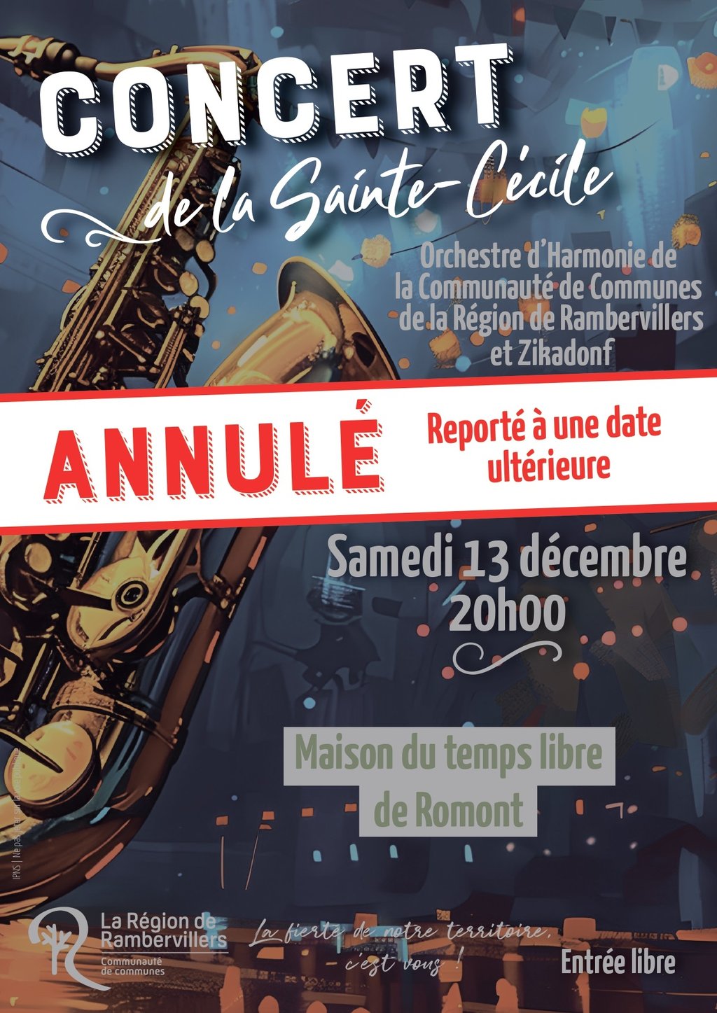Le concert de la Sainte-Cécile, prévu le samedi 13 décembre à Romont et organisé par l'école de musique de la Communauté de Communes de la Région de Rambervillers, est annulé.