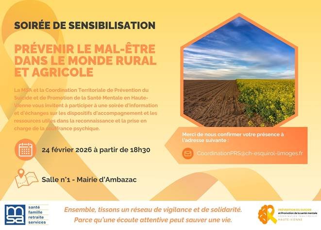 Dans le cadre de la feuille de route ministérielle pour la prévention du mal-être agricole, la Coordination Territoriale de Prévention du Suicide 87 et la MSA vous invitent à un temps d’échange et de sensibilisation sur la stratégie nationale de Prévention du Suicide et le réseau Sentinelle du monde agricole.