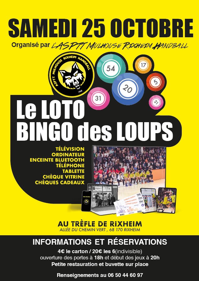 L'ASPTT Mulhouse Rixheim Handball organise son loto bingo des loups samedi 25 octobre à la Salle du Trèfle.