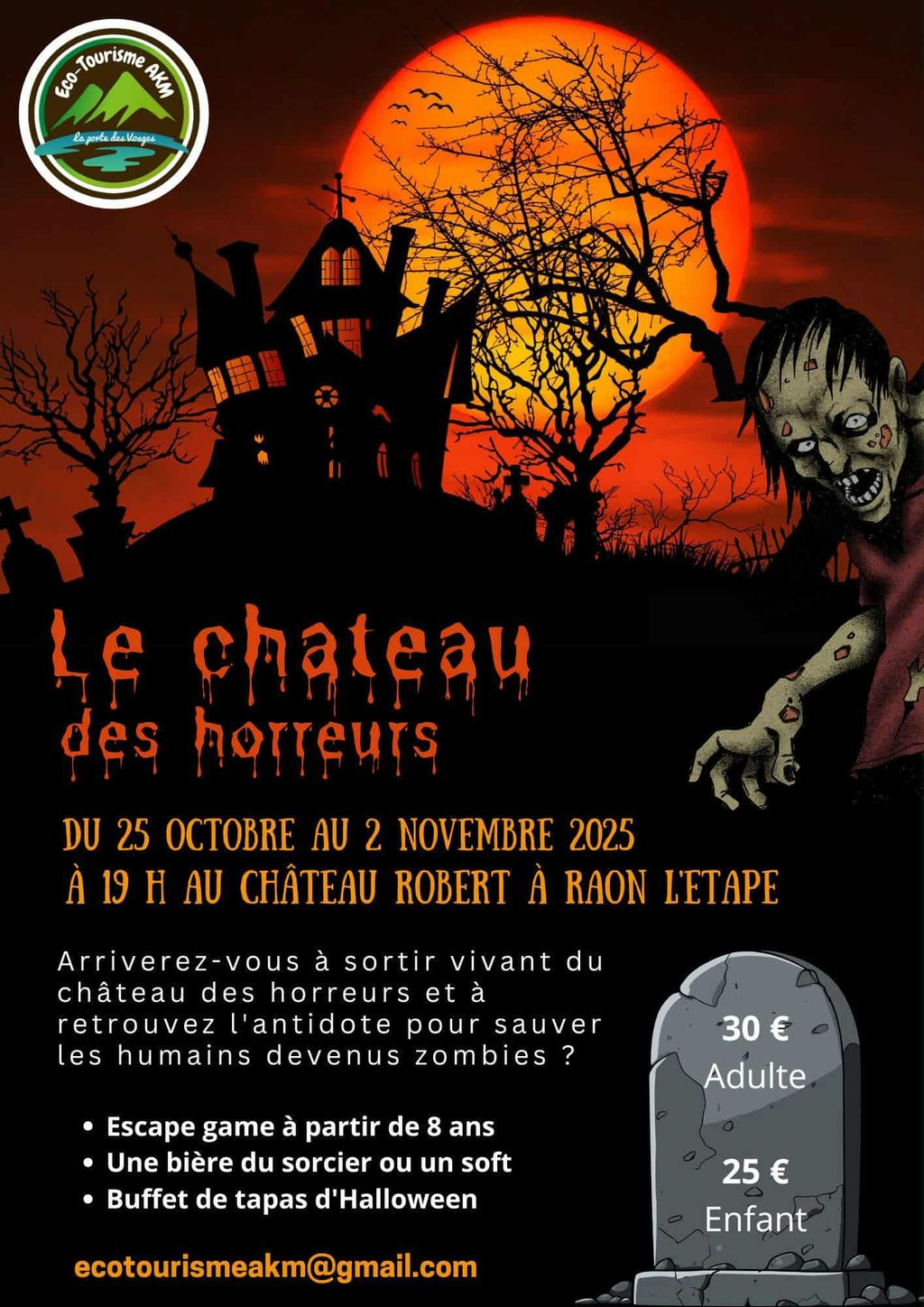 Semaine de la trouille L'association Eco-Tourisme AKM vous propose, du 25 octobre au 2 novembre à 19 h, une semaine de la trouille et notre escape game spécial Halloween, à l'intérieur du château Robert, rue du joli bois prolongée, sur le thème des zombies, avec un apéro de l'horreur. Concours de déguisements les soirées du 31 octobre et du 1er novembre 2025. ✓ La soirée comprend : - escape game à partir de 8 ans - buffet de mignardises salées et sucrées spéciales Halloween - une bière du sorcier ou un soft (sans alcool) (Possibilité d'acheter une bière du sorcier supplémentaire ou un soft lors de la soirée) ✓ Tarif de 30 € pour les adultes et 25 € pour les enfants (moins de 12 ans)