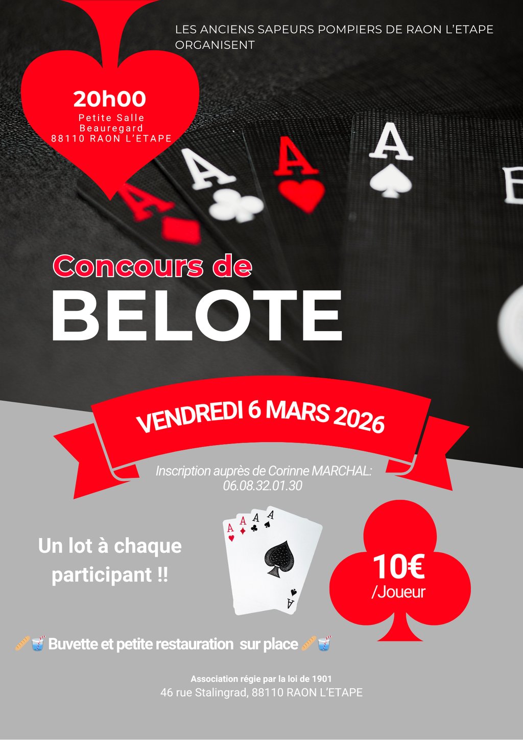 Les anciens sapeurs-pompiers de Raon-l’Étape organisent un concours de belote le vendredi 6 mars 2026 , à la petite salle Beauregard.